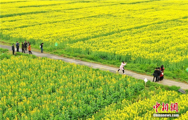 3月2日,江西省吉水縣烏江鎮(zhèn)楓坪千畝油菜花基地油菜花盛開(kāi),許多游客前來(lái)觀賞拍照徜徉在花海中。郭弘毅 攝