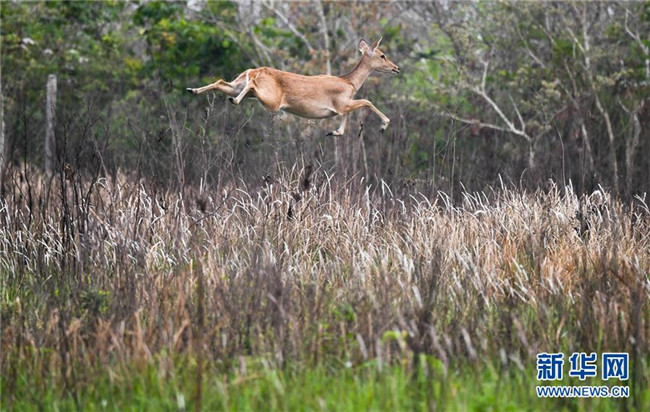 在海南大田坡鹿自然保護(hù)區(qū)內(nèi),一只坡鹿飛躍草叢(2018年4月3日攝)。國家一級(jí)保護(hù)動(dòng)物海南坡鹿是特產(chǎn)于海南島的熱帶珍稀鹿種,20世紀(jì)曾瀕臨滅絕。近年來,當(dāng)?shù)赝ㄟ^多種方式開展保護(hù)?,F(xiàn)在,海南坡鹿數(shù)量逐漸增多、種群逐漸穩(wěn)定,成為海南綠色生態(tài)的一張名片。 新華社記者 楊冠宇 攝