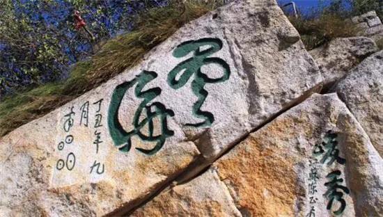在蒼龍嶺上方平臺(tái)邊崖上刻有“云海”二字,落款就是“OO”題,不知“OO”是什么字?有人說是“昌”“明”二字,有人說是陜西關(guān)中方言“jiao”(意思就是太陽光很火辣),到底是什么字,至今既無稽可考,也無典可查,成為一大字謎。