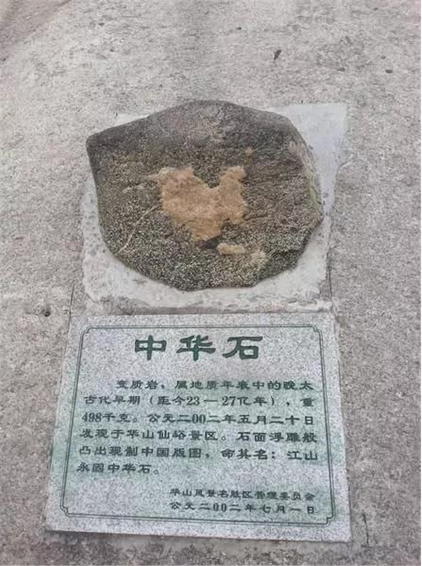 “中華石”于2002年5月20日在華山仙峪景區(qū)被發(fā)現(xiàn)。在一淡墨色花崗巖石面上,浮雕般凸現(xiàn)出一塊白色石圖,此圖酷似現(xiàn)制中國版圖,十分形象逼真。該石重約498千克,云母花崗巖石,大約形成于三千萬年前的白堊時期,現(xiàn)置北峰。