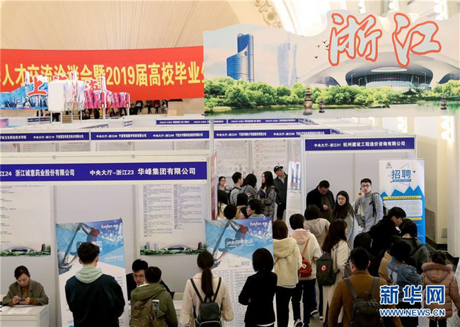 3月24日,求職者在招聘會上與招聘單位交流。當(dāng)日,由上海、江蘇、浙江、安徽聯(lián)合舉辦的“長三角地區(qū)春季人才交流洽談會暨2019屆高校畢業(yè)生擇業(yè)招聘會”在上海展覽中心舉行。 新華社記者 劉穎 攝