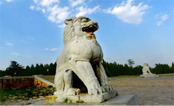 在橋陵的石雕中,特別值得一提的是橋陵的一對石獅子,歷經(jīng)千年的風(fēng)雨侵蝕,可威風(fēng)依然不減當(dāng)年,四肢健壯、昂首挺胸、怒目圓睜,顯示出“天地之間,唯我獨尊”的傲氣、霸氣,它造型優(yōu)美,氣勢磅礴,體現(xiàn)出唐代粗礦、奔放的時代氣息,而最讓人叫絕的是它的尾巴,從腿底鉆進(jìn)又掏出來卷曲于背部,動物的調(diào)皮可愛活靈活現(xiàn)展現(xiàn)在我們眼前。它是石刻中的精品,石刻的精美,氣魄的宏大,堪稱“東方第一獅”。像這樣的獅子四個門前都有,保存的特別完好,東門的回頭望,西門的卷舌獅在唐代帝王陵中都是絕無僅有的。