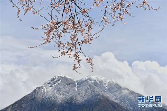 波密縣古鄉(xiāng)嘎朗村的桃花與雪峰相映成趣(4月2日攝)。 新華社記者 李鑫 攝
