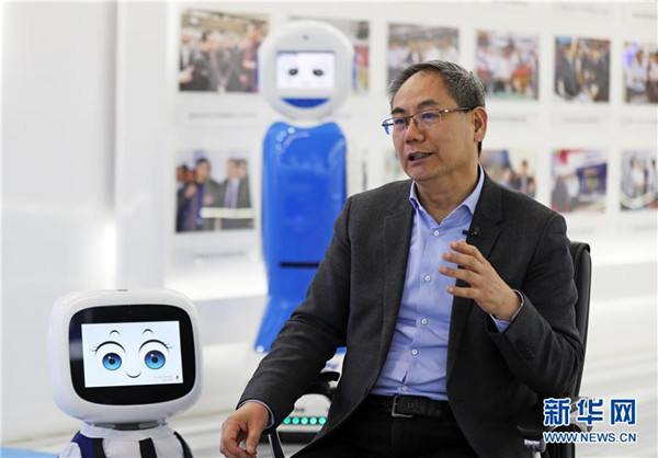 3月29日,沈陽新松機(jī)器人自動化股份有限公司創(chuàng)始人兼總裁曲道奎和公司生產(chǎn)的機(jī)器人互動。 新華社記者 楊青 攝