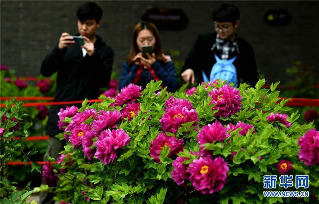 4月13日,游客在石家莊市正定榮國府影視基地游覽拍照。時下,河北石家莊正定榮國府影視基地內(nèi)的牡丹花次第開放,在春雨的滋潤下顯得格外晶瑩剔透、美麗嬌艷。 新華社發(fā)(陳其保 攝)