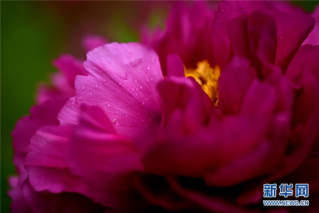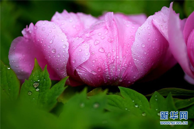這是在石家莊市正定榮國府影視基地拍攝的牡丹花(4月13日攝)。時下,河北石家莊正定榮國府影視基地內(nèi)的牡丹花次第開放,在春雨的滋潤下顯得格外晶瑩剔透、美麗嬌艷。 新華社發(fā)(陳其保 攝)