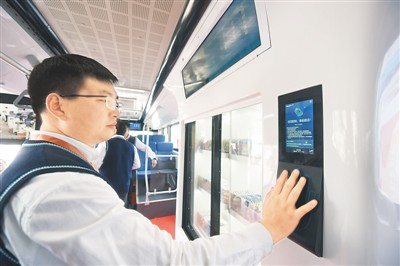 2019中國(上海)國際技術(shù)進(jìn)出口交易會(huì)上,工作人員在智能熊貓巴士上演示利用掌脈進(jìn)行購物。龍巍 攝(人民視覺)