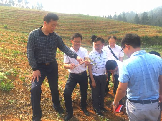 宋建朝委員(左一)在安順市西秀區(qū)檢查安順山藥生長(zhǎng)情況