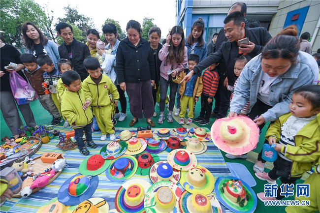 4月28日,家長帶著孩子們在挑選喜歡的手工作品。 新華社記者 徐昱 攝
