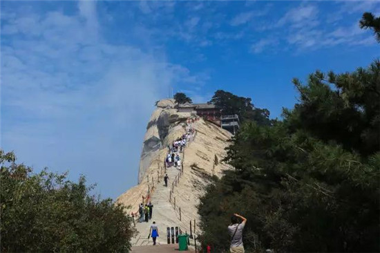 華山的石徑與別的山不同,別的山的路是砌出來的,而華山因為整座山是整塊石,又是質(zhì)地堅硬的花崗巖,路都是在山體上鑿刻出來的。
