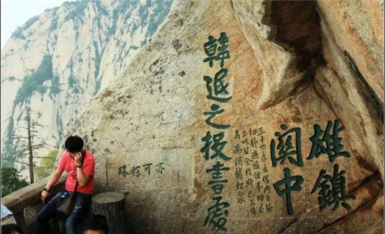 一座山就是一塊花崗巖巨石,自古華山一條道,唐時韓愈游華山,雄心勃勃,攀至蒼龍嶺時,向下望了一眼,頓時覺得頭暈目眩,兩腿打戰(zhàn),兩腋生風,再也不敢挪動一步,趺坐于山脊一凹處,上不去,下不來,走投無路。絕望之下,將衣衫撕成片,寫下求救信,扔下山崖,終有一條被人揀到,報與官府,這才得救。現(xiàn)有蒼龍嶺“韓愈投書處”為證。
