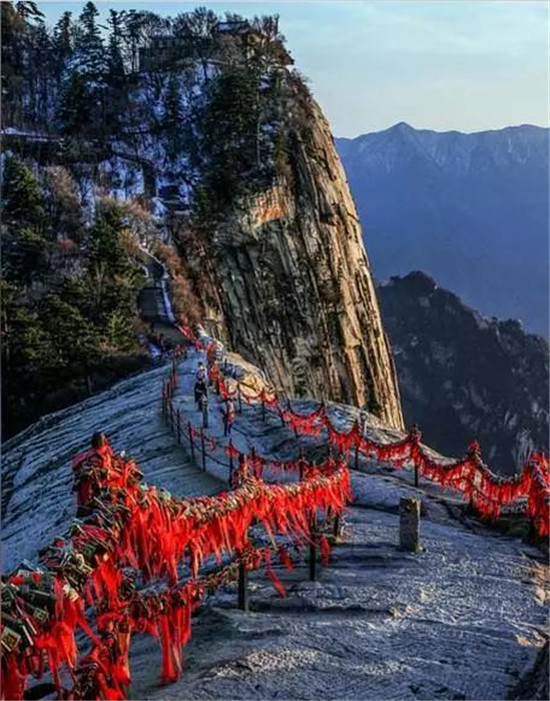 華山山體倚天拔地,四面如削,更有千尺幢、百尺峽、蒼龍嶺、鷂子翻身、長空棧道等十分險峻之地,被譽為“奇險天下第一山”。