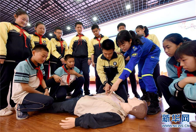 5月12日,邢臺市第八中學(xué)學(xué)生在藍(lán)天救援隊隊員的指導(dǎo)下學(xué)習(xí)心肺復(fù)蘇急救技能。 新華社記者 朱旭東 攝