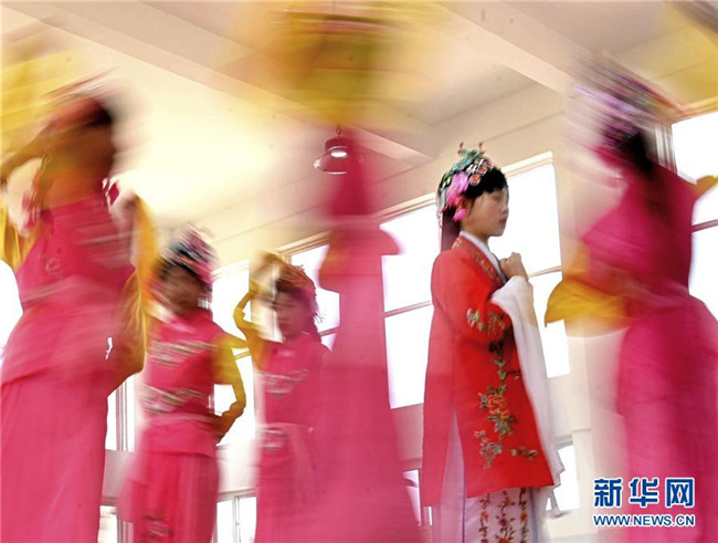 5月14日,淄博市沂源縣東里鎮(zhèn)水北小學(xué)的學(xué)生在練習(xí)戲曲表演。 新華社發(fā)(趙東山 攝)