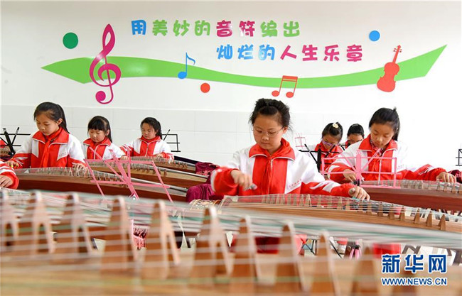 5月14日,淄博市沂源縣振興路小學(xué)的學(xué)生在學(xué)習(xí)彈奏古箏。 新華社發(fā)(趙東山 攝)