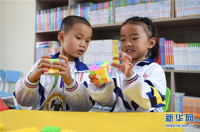5月14日,在銅仁市松桃苗族自治縣盤石鎮(zhèn)響水洞村的山村幼兒園,孩子們在玩魔方。新華社發(fā)(龍元彬 攝)