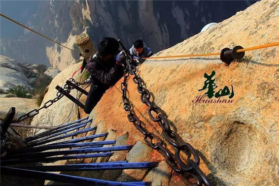 懸空千米,華山長空棧道更換腐朽木板
