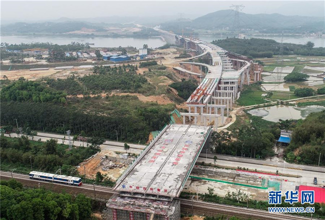 4月2日,由廣東省交通集團(tuán)投資建設(shè)、中鐵四局承建的汕(頭)湛(江)高速公路北江特大橋跨京廣鐵路、國(guó)道G240轉(zhuǎn)體橋成功轉(zhuǎn)體,這是轉(zhuǎn)體橋轉(zhuǎn)體后的位置(無(wú)人機(jī)拍攝)。 新華社記者 劉大偉 攝