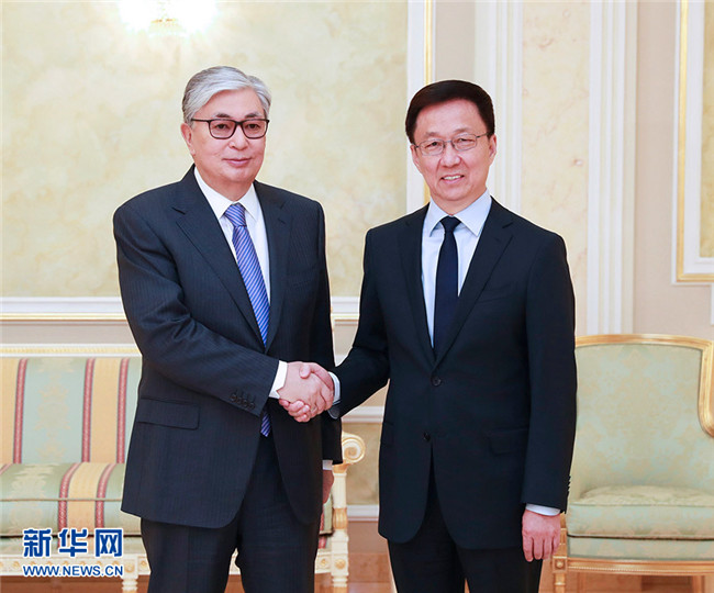 在會見托卡耶夫時,韓正首先轉達了習近平主席對托卡耶夫總統的親切問候。韓正說,在兩國元首的戰(zhàn)略引領和親自推動下,中哈全面戰(zhàn)略伙伴關系快速發(fā)展,雙方政治互信日益加深,各領域合作處于歷史最好水平,在地區(qū)乃至全世界樹立了睦鄰友好、互利共贏的典范。上個月習近平主席同納扎爾巴耶夫首任總統舉行了富有成果的會晤,向他頒授中華人民共和國“友誼勛章”,向國際社會展現了中哈關系的高水平和特殊性。共建“一帶一路”已成為中哈合作主線,雙方在發(fā)展戰(zhàn)略對接、合作機制建設、重大項目推進等方面碩果累累。中方愿與哈方一道,繼續(xù)深化絲綢之路經濟帶與“光明之路”新經濟政策對接,以產能、貿易、互聯互通、農業(yè)、高技術、金融合作為優(yōu)先方向,不斷提升中哈合作含金量,更好地造福兩國和兩國人民。中方祝愿哈方順利實施“2050戰(zhàn)略”,在國家發(fā)展事業(yè)中不斷取得新的輝煌成就。