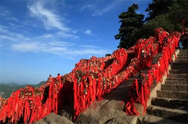 如果走到華山之上的金鎖關時,就會發(fā)現(xiàn)一番令人動容的風景:關內(nèi)、關外登山路兩側(cè)的鐵索上,情侶鎖重重疊疊,紅繩彩線迎風搖曳,筑成了一道美麗的愛情心愿風景線。