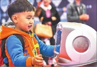 首屆新疆智能產(chǎn)業(yè)博覽會上,小朋友在與一款智能機(jī)器人互動。新華社發(fā)