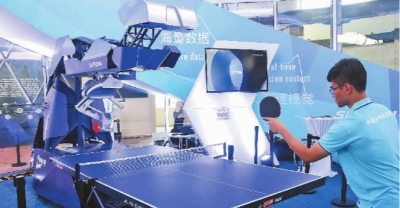 工作人員在2018世界人工智能大會現(xiàn)場演示與機(jī)器人打乒乓球。新華社發(fā)