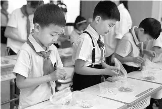 “剝毛豆比賽是學(xué)校的保留節(jié)目,每屆二年級孩子都要參加。一開始只是一項(xiàng)有趣的比賽,為了讓孩子體驗(yàn)勞動(dòng)的快樂。今年我讓一二年級每個(gè)班都布置了這項(xiàng)作業(yè),并要求作為一項(xiàng)長期的作業(yè)。”蔣曉說。