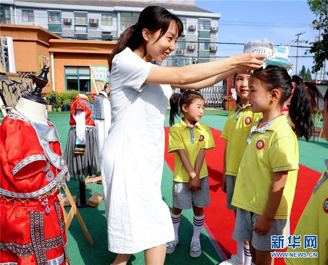5月28日,老師帶領(lǐng)孩子們認(rèn)識(shí)不同民族的服飾。