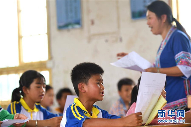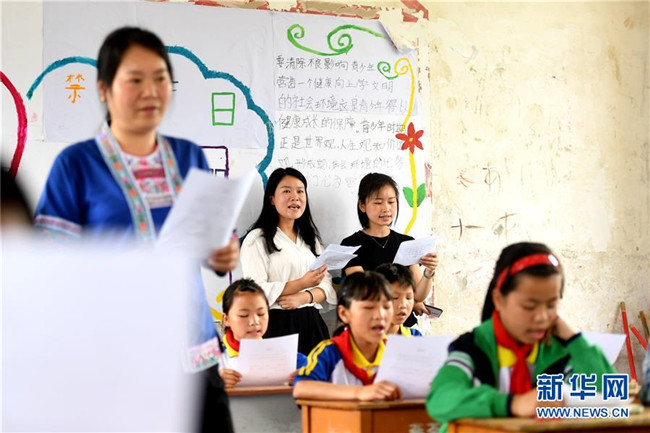 5月27日,在廣西柳州市三江侗族自治縣良口鄉(xiāng)燕茶村燕子小學,吳純娟在教五年級的學生唱侗族大歌。