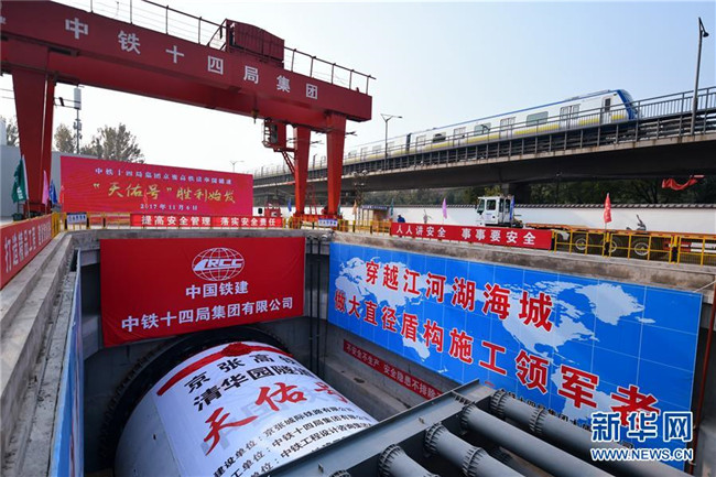 京張高鐵清華園隧道“天佑號(hào)”盾構(gòu)機(jī)始發(fā)掘進(jìn)(2017年11月6日攝)。新華社記者 張晨霖 攝