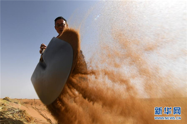 在庫(kù)布其沙漠中的白土梁林場(chǎng)沙棘林內(nèi),林場(chǎng)管理員鄧勝利展示沙棘樹(shù)剪枝育苗技術(shù)(2018年8月1日攝)。當(dāng)?shù)赝ㄟ^(guò)種植沙棘,既解決了荒漠化問(wèn)題,又幫助農(nóng)牧民增收,實(shí)現(xiàn)了生態(tài)和經(jīng)濟(jì)雙重效益。 新華社記者 張善臣 攝