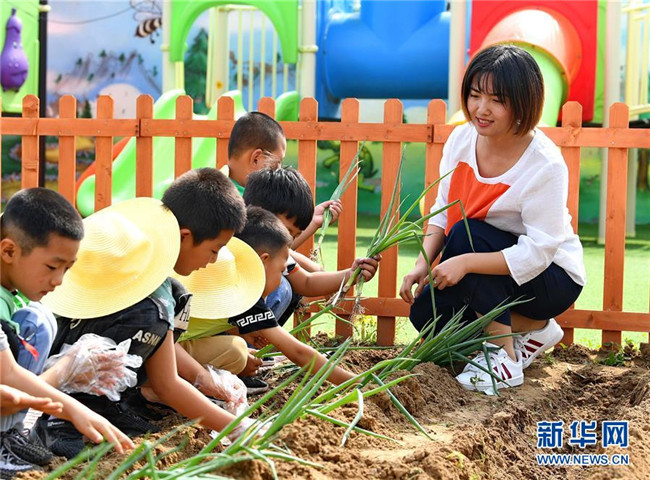 6月17日,樂亭縣大相各莊鄉(xiāng)幼兒園老師在勞動(dòng)實(shí)踐基地的小菜園里教孩子們?cè)苑N大蔥。新華社記者楊世堯攝