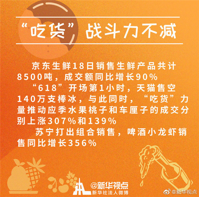 京東生鮮18日銷售生鮮產(chǎn)品共計(jì)8500噸,成交額同比增長90%。6月16日第1小時,天貓售空140萬支棒冰,“吃貨”力量推動應(yīng)季水果桃子和車?yán)遄映山活~分別上漲307%和139%。蘇寧打出組合銷售,啤酒小龍蝦銷售同比增長356%……
