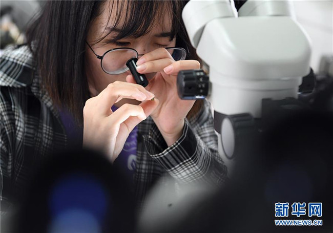 在長安大學珠寶鑒定實驗室,地質(zhì)學專業(yè)寶玉石學與珠寶鑒定方向的學生在觀測樣本(5月28日攝)。新華社記者張博文攝