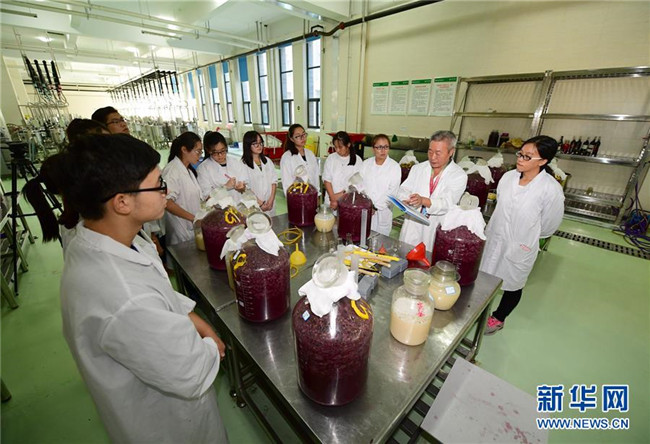 西北農(nóng)林科技大學葡萄與葡萄酒工程專業(yè)學生在葡萄酒釀造課上聽取李華教授(右二)講解注意事項(2017年9月7日攝)。新華社記者邵瑞攝