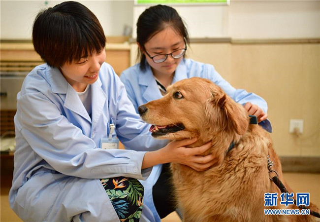 西北農(nóng)林科技大學動物醫(yī)學專業(yè)學生在學校的動物醫(yī)院內(nèi)安撫一只寵物狗(5月25日攝)。新華社記者邵瑞攝