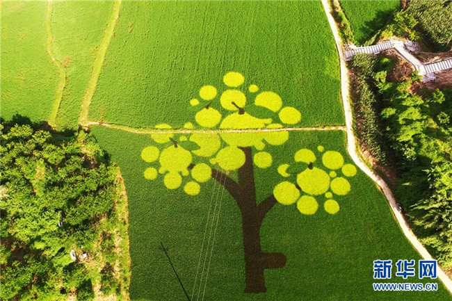 仲夏時節(jié),在重慶忠縣新立鎮(zhèn)中嶺社區(qū)出現(xiàn)水稻拼成的“笑臉”“橘子”等圖案,成為一道靚麗的鄉(xiāng)村田園風(fēng)景線。新華社記者 王全超 攝
