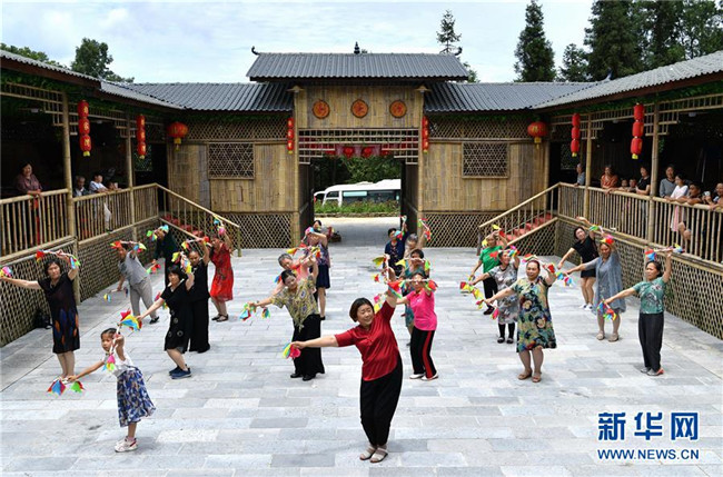 7月1日,游客在湖北省恩施土家族苗族自治州宣恩縣珠山鎮(zhèn)車(chē)洞坪民宿旅游區(qū)體驗(yàn)土家族“八寶銅鈴舞”。 新華社發(fā)(宋文 攝)