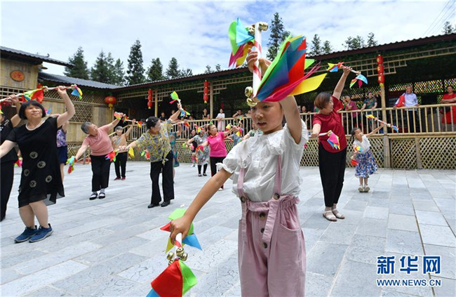 7月1日,游客在湖北省恩施土家族苗族自治州宣恩縣珠山鎮(zhèn)車(chē)洞坪民宿旅游區(qū)體驗(yàn)土家族“八寶銅鈴舞”。新華社發(fā)(宋文 攝)