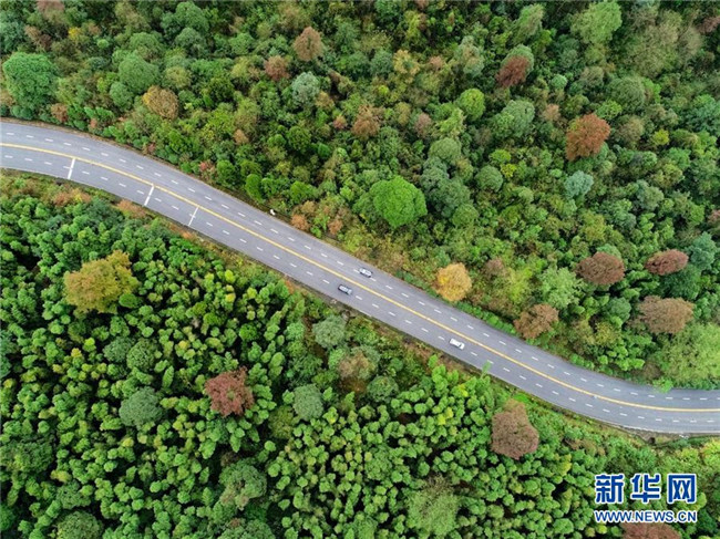 車輛行駛在國家第一條四車道盤山公路泰井高速上(2018年11月21日無人機拍攝)。新華社記者 胡晨歡 攝