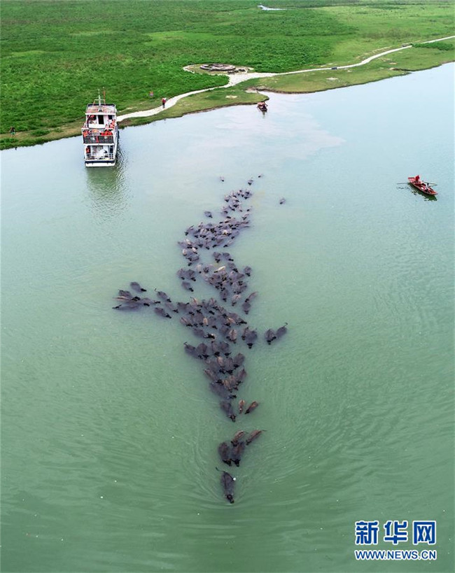 7月2日傍晚,在四川省南充市蓬安縣油房溝村,百余頭水牛橫渡嘉陵江歸欄(無(wú)人機(jī)拍攝)。新華社發(fā)(劉永紅攝)