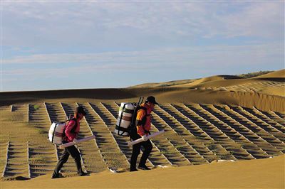 “沙袋內只需充填干沙,平鋪于沙表面即完成了聚乳酸沙袋沙障的鋪設。同草方格等傳統(tǒng)沙障相比較,其鋪設效率可提高3至5倍、材料搬運量降低20至60倍。障體材料輕便,真正實現了‘以沙治沙’的科學理念。”虞毅說。