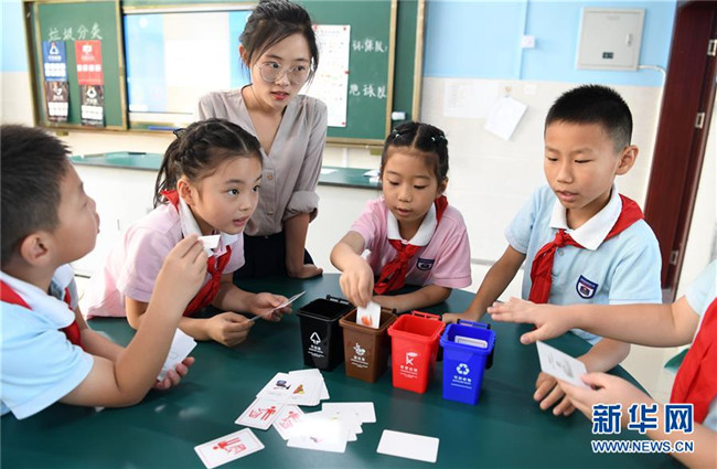 7月11日,合肥市建平實(shí)驗(yàn)小學(xué)學(xué)生在老師引導(dǎo)下參與垃圾分類小游戲。