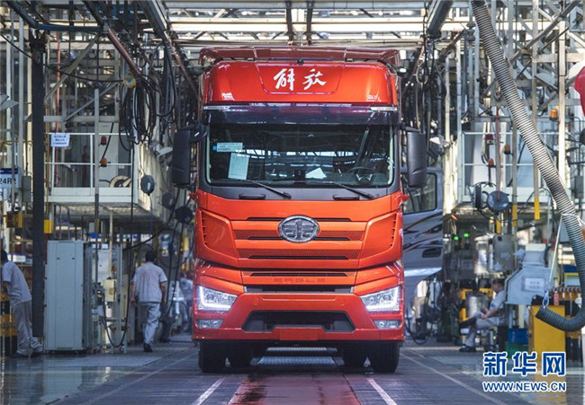 這是在位于吉林長春的一汽解放總裝車間內(nèi)拍攝的待出廠的解放J7卡車(6月12日攝)。新華社記者許暢攝