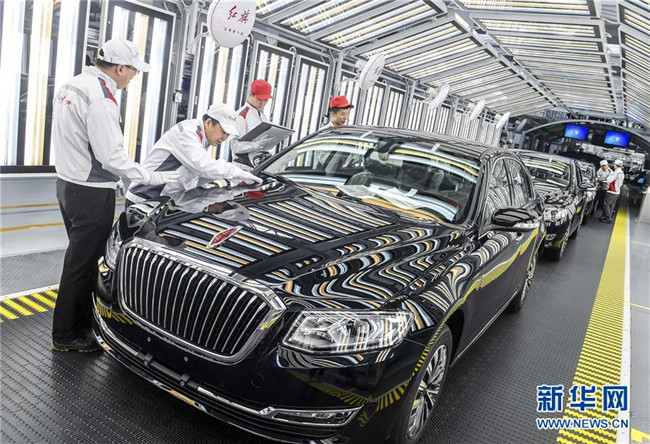工人在位于吉林長春的一汽紅旗總裝車間內(nèi)進行車輛靜檢作業(yè)(4月9日攝)。新華社記者許暢攝