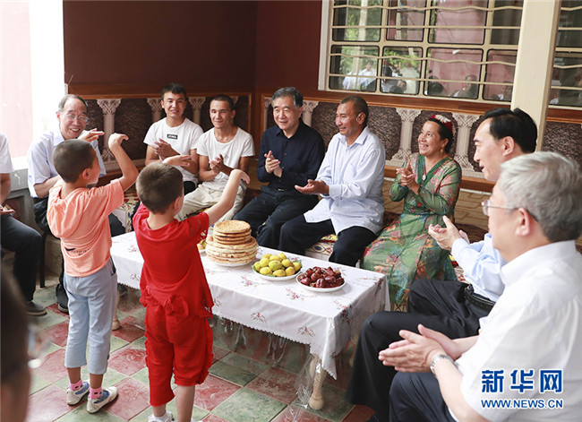 7月14日至16日,第七次全國對口支援新疆工作會議在新疆和田召開。中共中央政治局常委、中央新疆工作協(xié)調(diào)小組組長汪洋出席會議并講話。在和田期間,汪洋還參觀了對口援疆工作成就展,考察了有關單位和企業(yè),看望了脫貧戶。這是7月15日,汪洋在新疆和田英阿瓦提鄉(xiāng)吐如孜村考察。 新華社記者 丁林 攝
