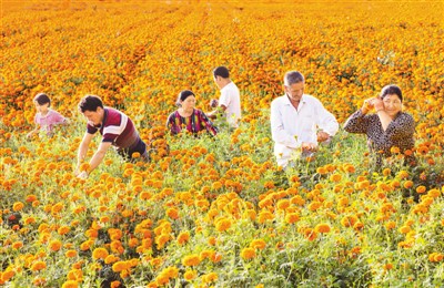 近年來,新疆維吾爾自治區(qū)的莎車晨光生物公司通過“公司+基地+合作社+農(nóng)戶”的形式帶動農(nóng)民大面積種植萬壽菊,7年來累計帶動農(nóng)民增收6億多元,實現(xiàn)出口創(chuàng)匯4357萬美元,繳納稅金1200多萬元,使5萬多貧困戶擺脫了貧困。圖為7月18日,莎車縣的維族群眾正在采摘被他們譽(yù)為“致富花”的萬壽菊。本報記者史家民攝