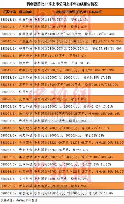 科創(chuàng)板首批25家上市公司上半年業(yè)績預(yù)告情況。制表:程春雨