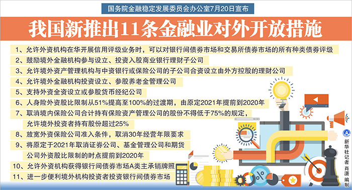 國務(wù)院金融穩(wěn)定發(fā)展委員會(huì)辦公室20日對(duì)外宣布,為貫徹落實(shí)黨中央、國務(wù)院關(guān)于進(jìn)一步擴(kuò)大對(duì)外開放的決策部署,按照“宜快不宜慢、宜早不宜遲”的原則,在深入研究評(píng)估的基礎(chǔ)上,推出以下11條金融業(yè)對(duì)外開放措施: