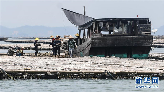 在欽州市龍門港連片萬畝大蠔養(yǎng)殖基地,村民在收取養(yǎng)殖的大蠔(7月20日攝)。新華社記者 張愛林 攝